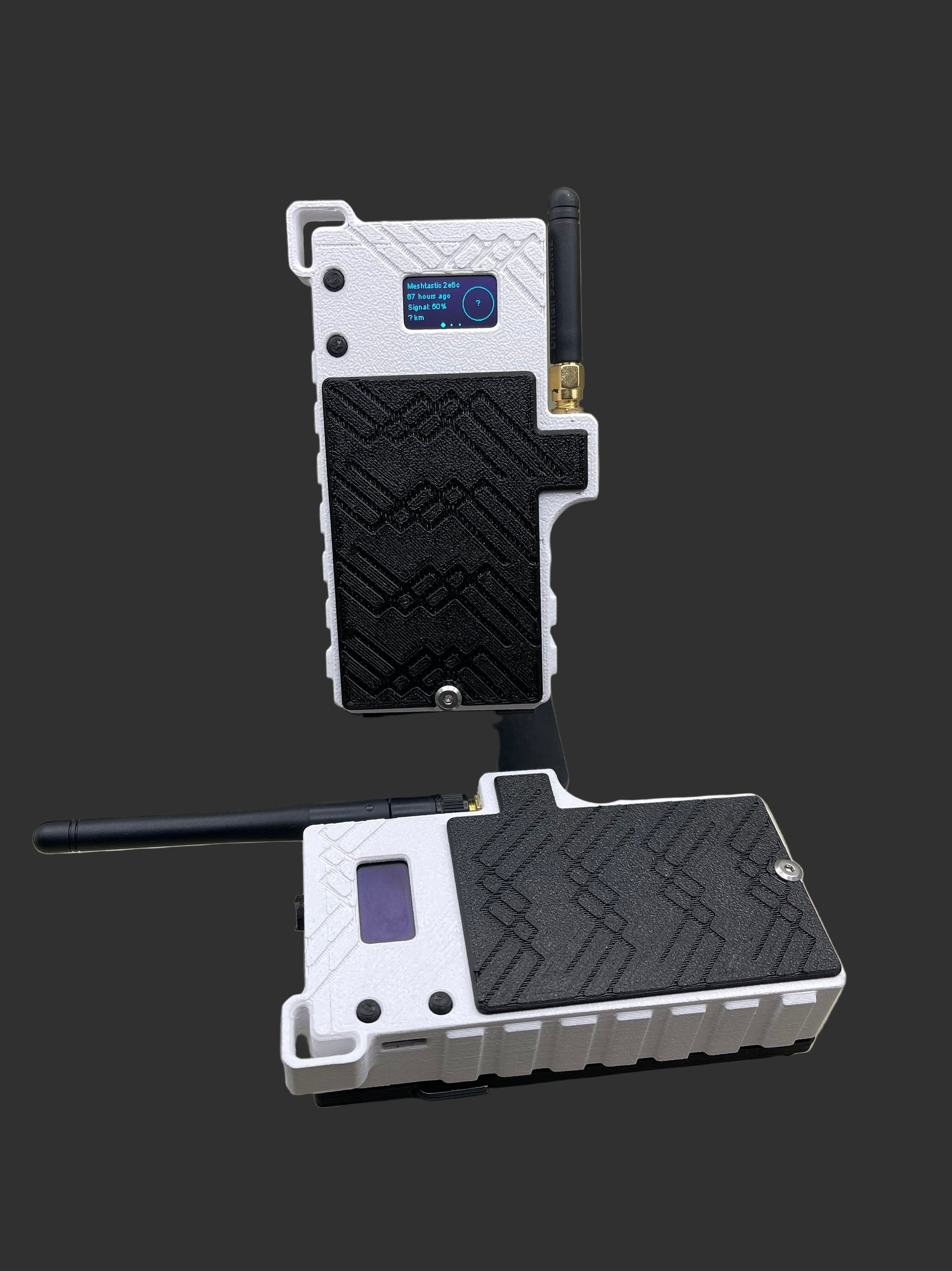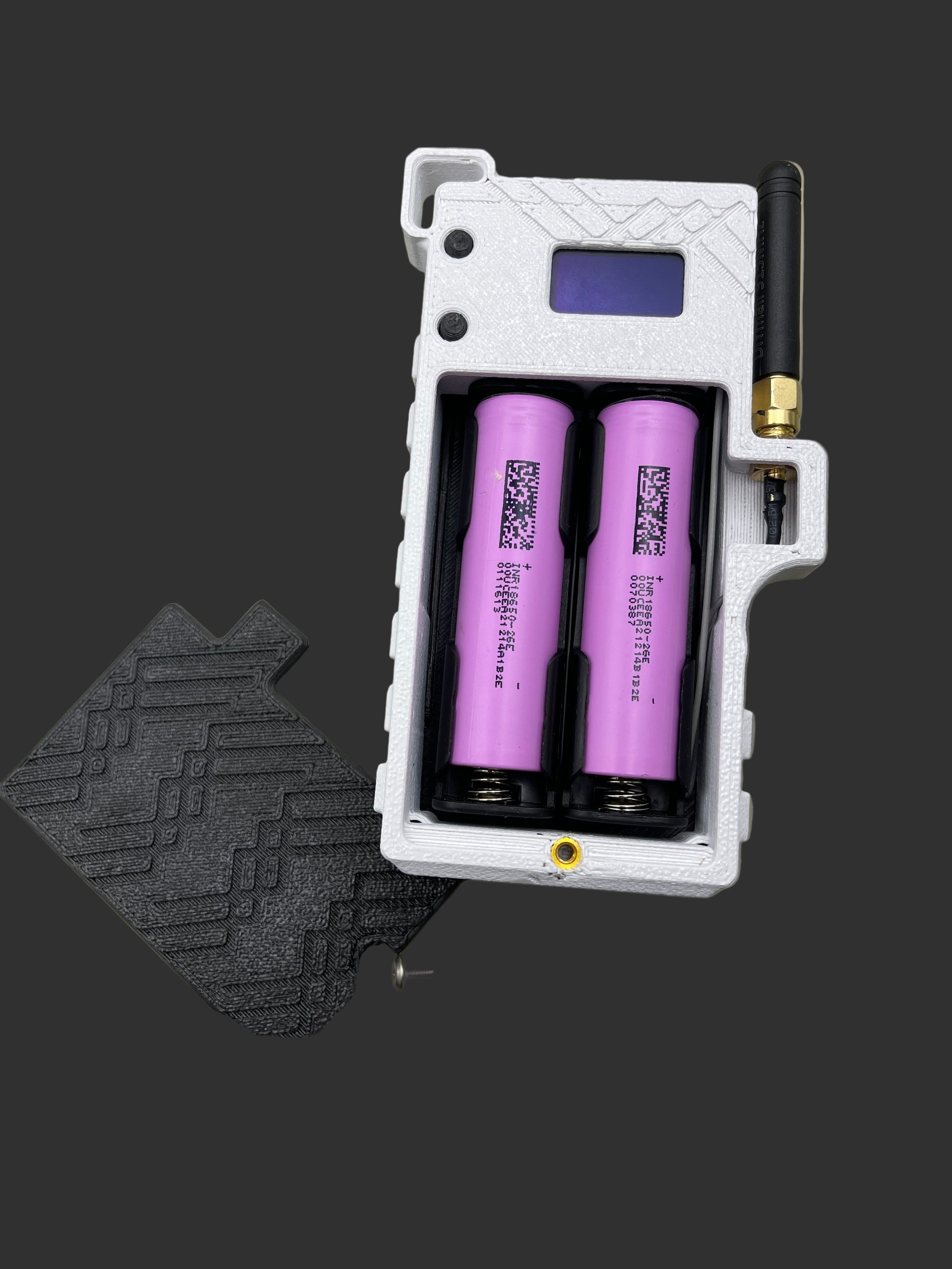 This case packs a punch. Designed to have up to 2 external antennas, 2 of the 18650 batteries, lanyard loop, and an Allen key built into the case to easily access the batteries so you can hot swap them at any given time.
