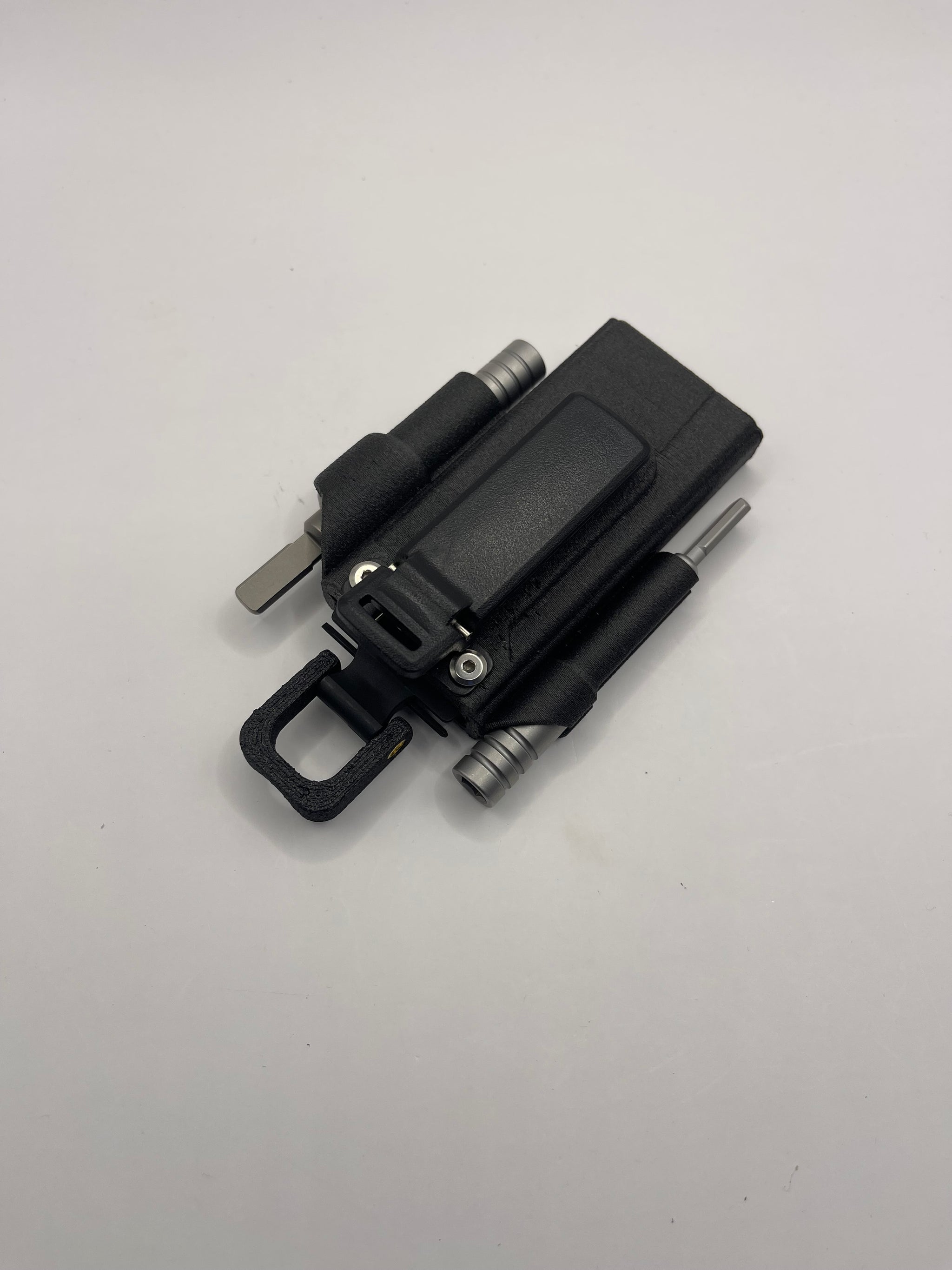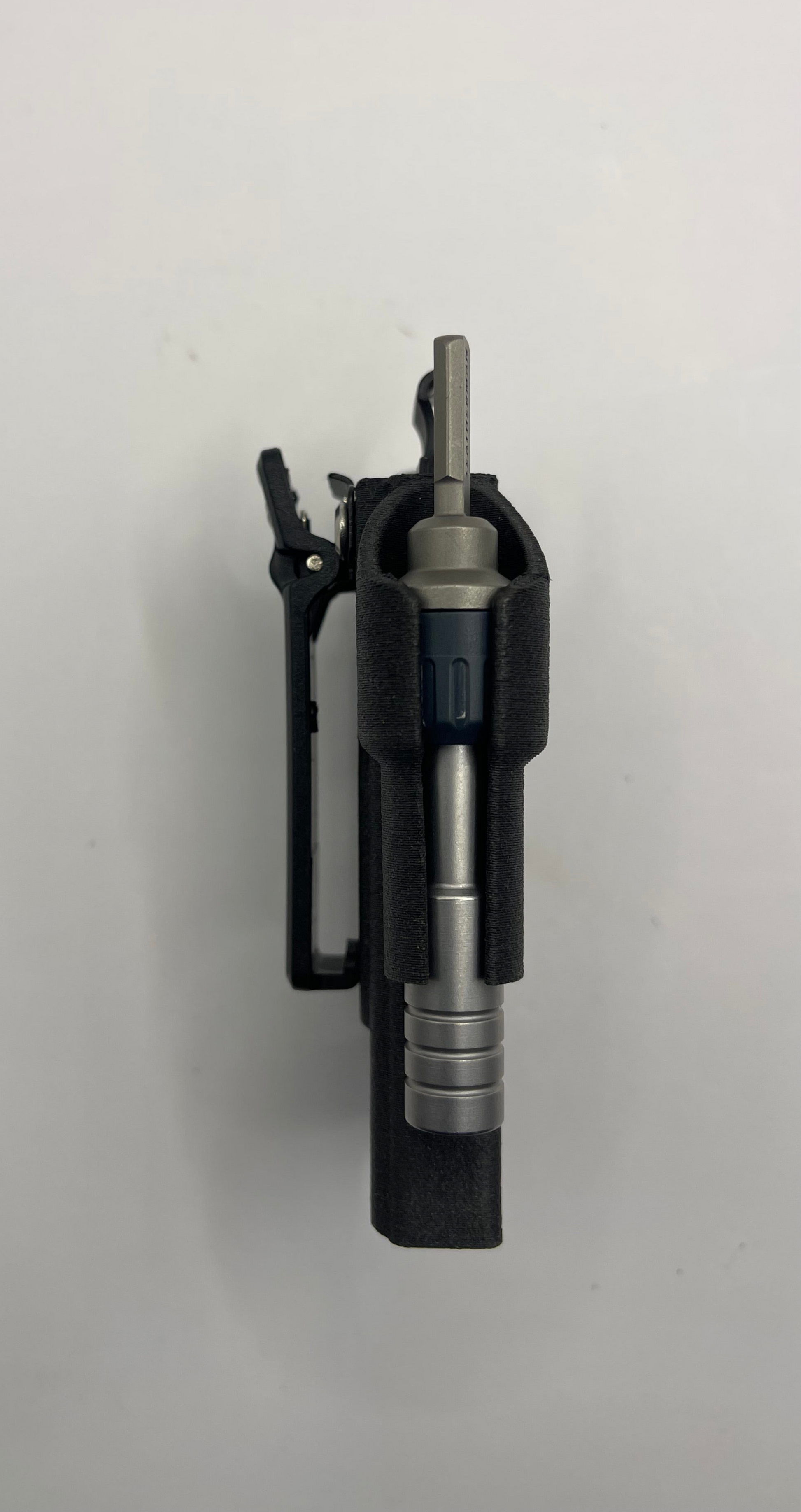 This holster holds up to one sleeve of bit kits, one bit kit ratchet extender, and one bit kit extender. Belt clip “snap on” style. Material is PA12-CF. Heat inserts hold the 3mm bolts that have a little thread lock on them as to not come loose and allow to belt clip to come off. The finger trap for the sleeve comes with the kit.
