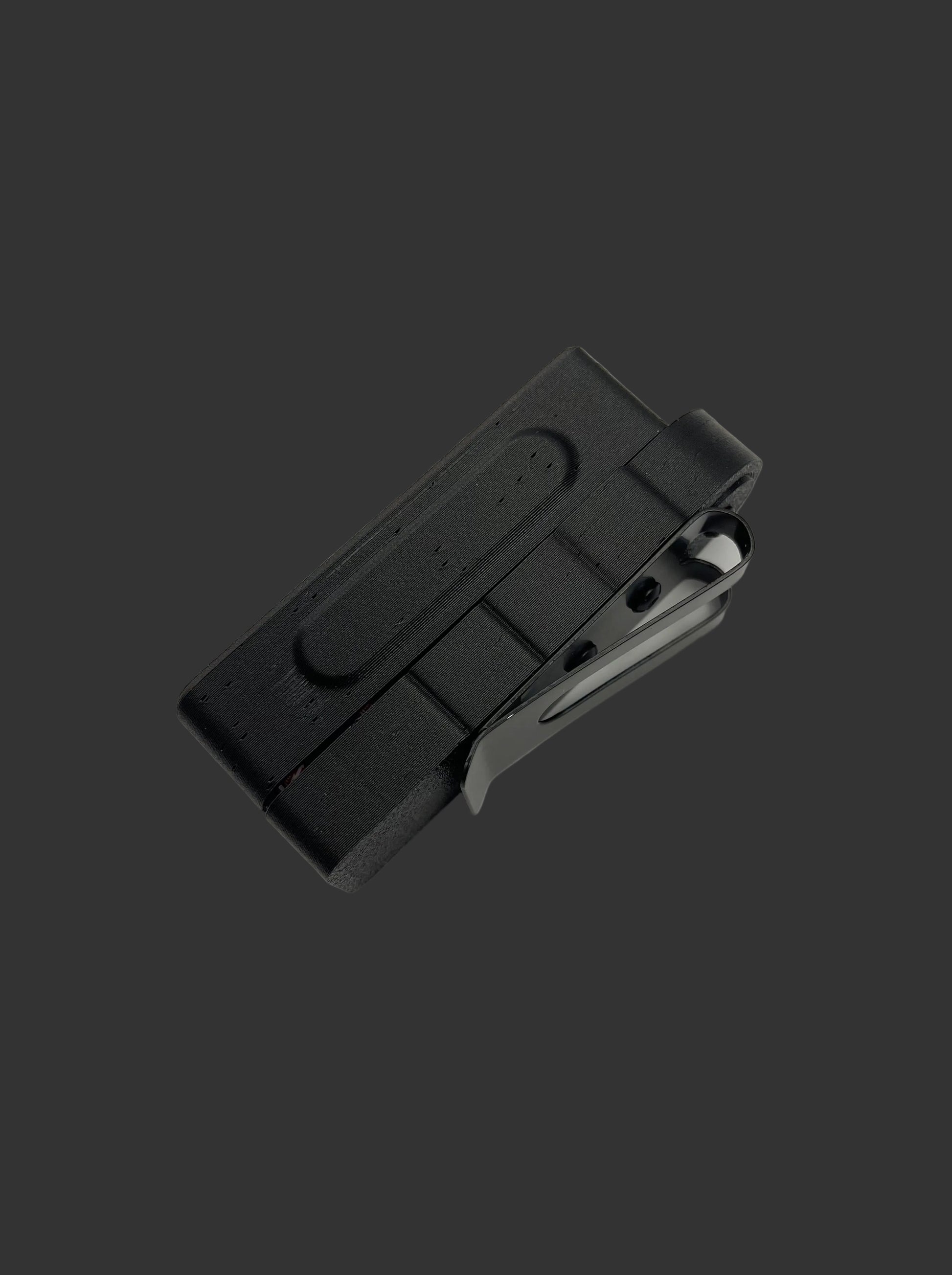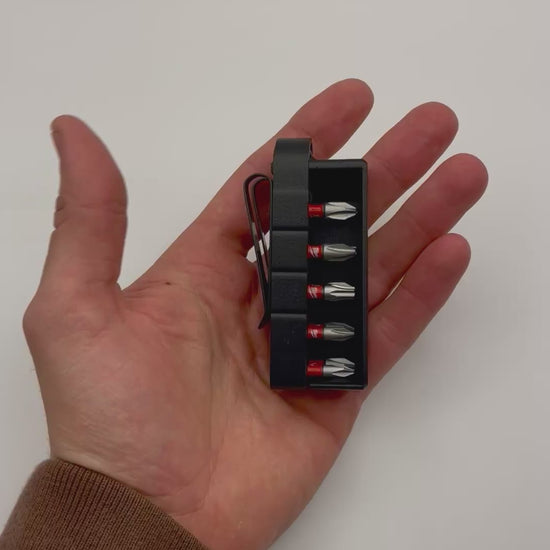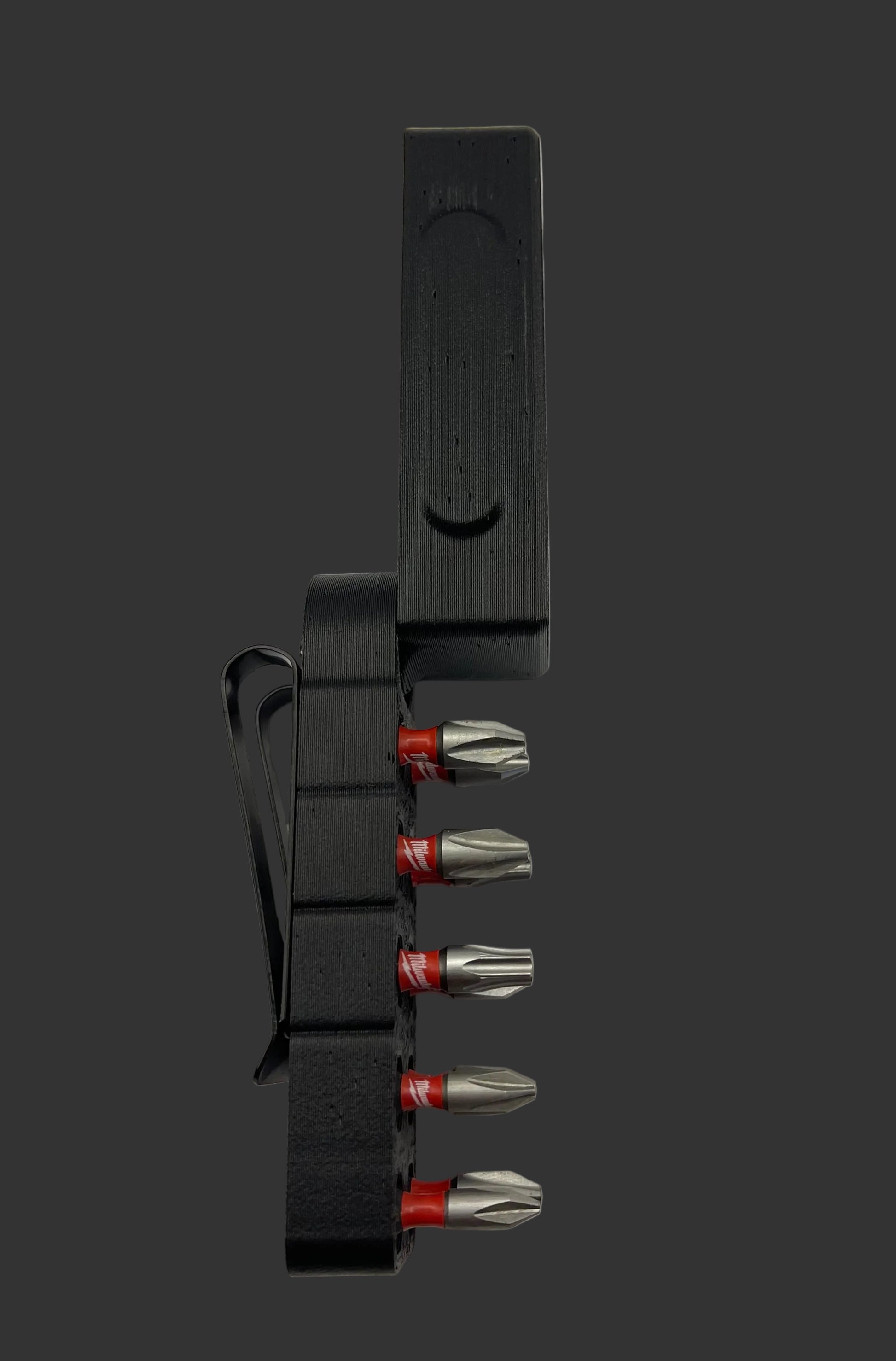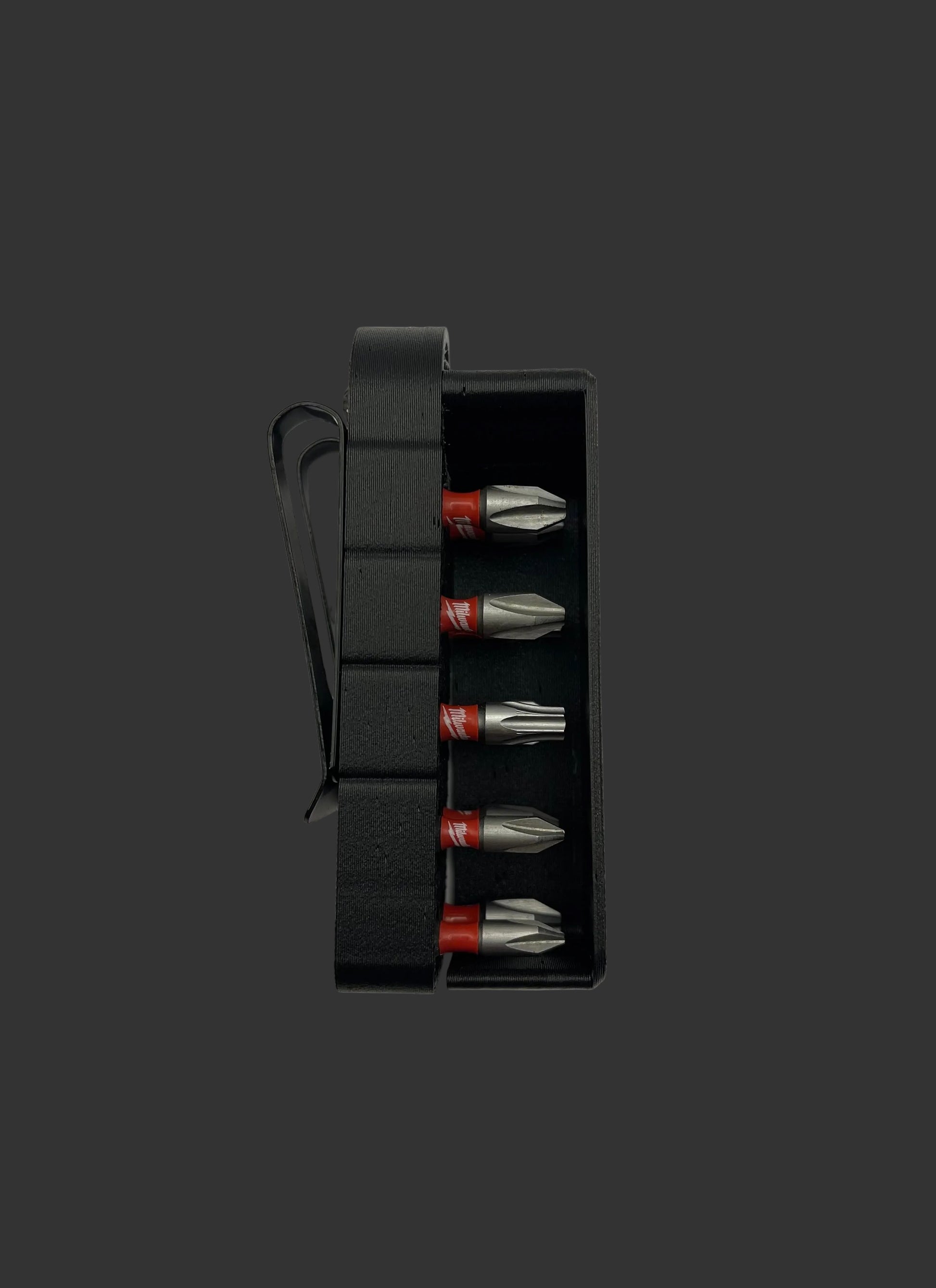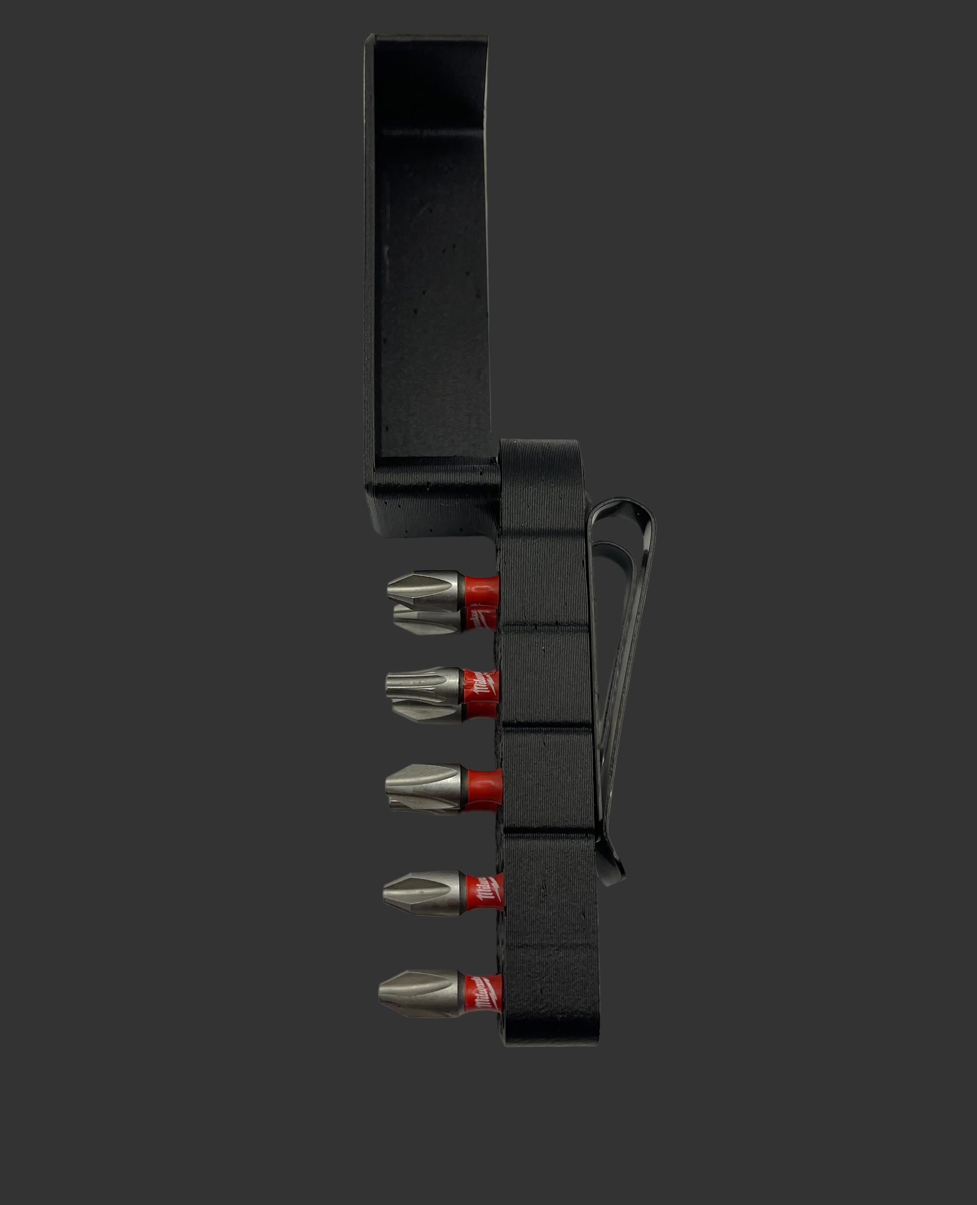 Holds up to 10 bits (smaller 1/4” bits). Magnets secure the bits in place. Sliding lid keeps the bits secure during movement. Standard clip for belts and hardware. Made of PETG-Carbon Fiber.